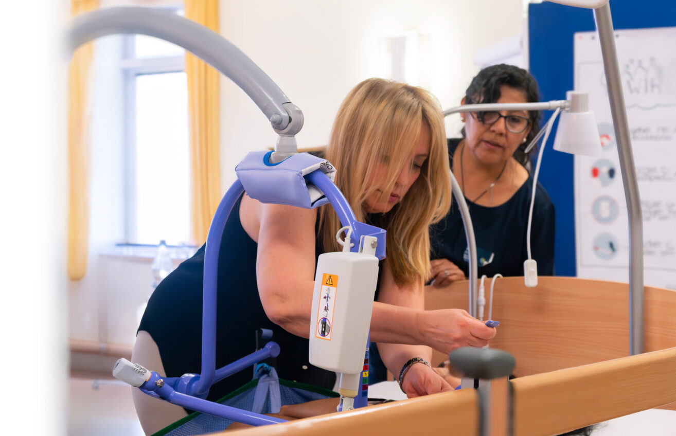 Kennenlernen der Pflege-Hilfsmittel unter Anleitung Zum Ausbildungsbeginn im April durften wir bei den Caritas-Einrichtungen gGmbH (CEG) insgesamt 13 neue Teammitglieder willkommen heißen. Ein wichtiger Teil des Einstiegs bei der CEG