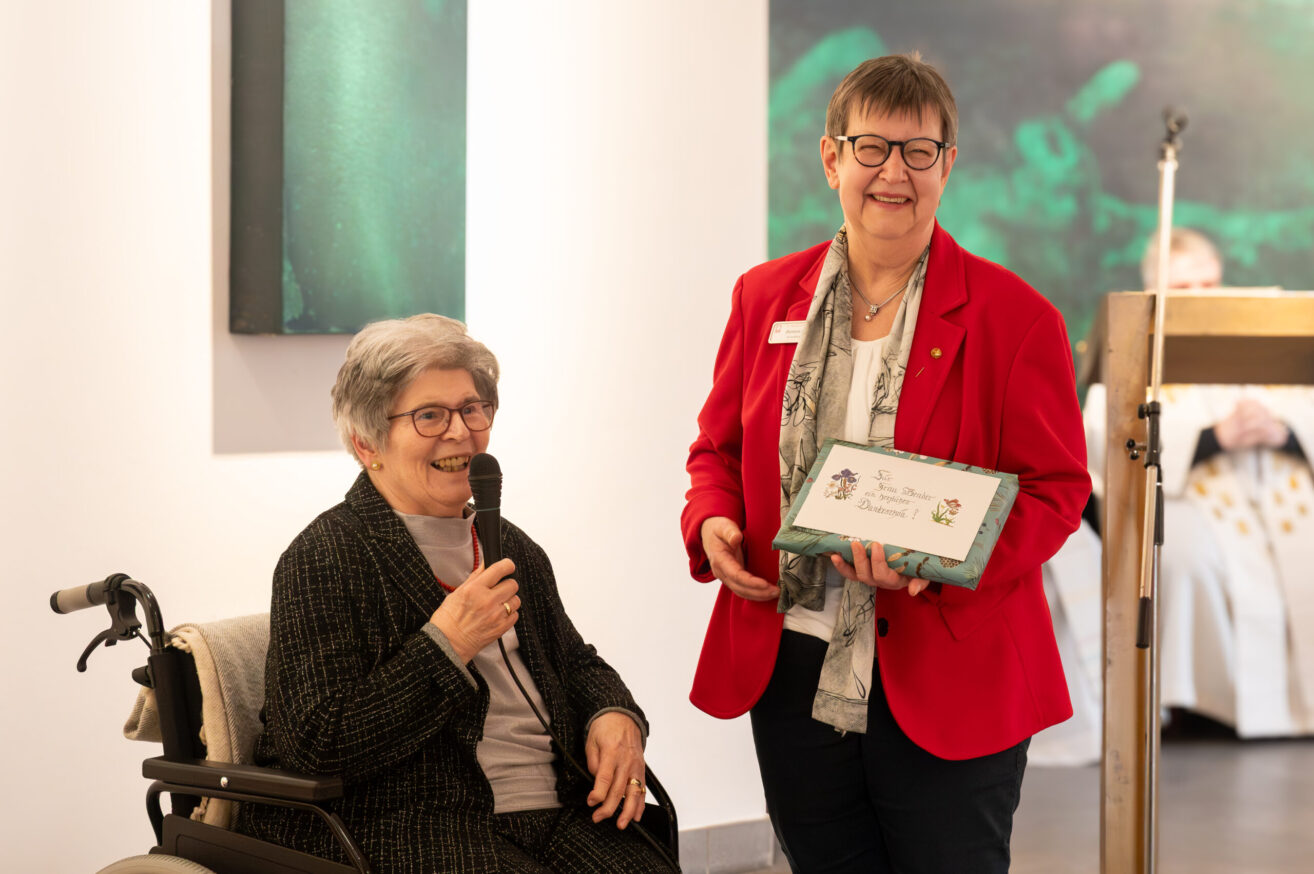 Heimbeiratsvorsitzende Elfriede Ruttor (links) überreicht Barbara Bender (rechts) ein Abschiedsgeschenk. Am 14. April wurde in unserer Senioreneinrichtung St. Hedwig in Veitshöchheim die langjährige Einrichtungsleitung Barbara Bender im Rahmen einer feierlichen